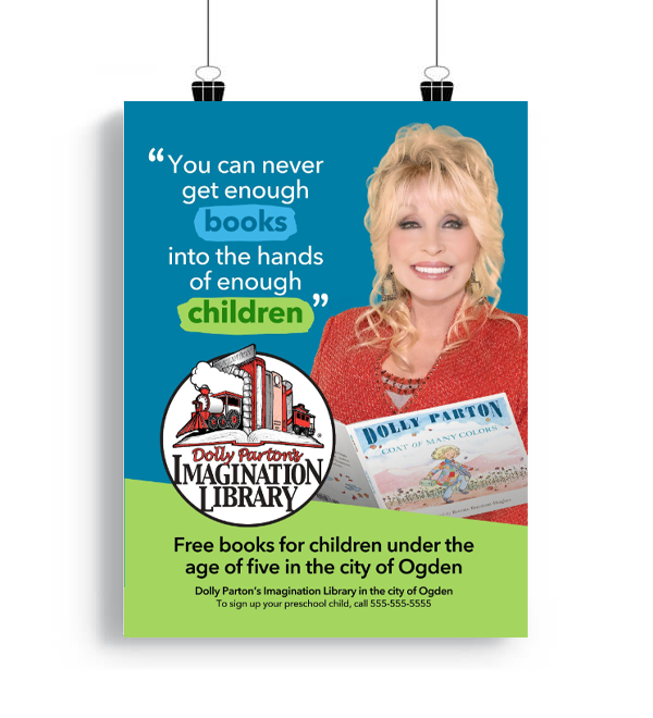 This fun poster is 20”(H) X 15”(W). It pictures Dolly holding her book “Coat of Many Colors” and can be customized with your local information. This item is sold in a minimum quantity of 50 posters. During purchase, you can provide your customized message and increase the order quantity as needed. Shipping is additional.